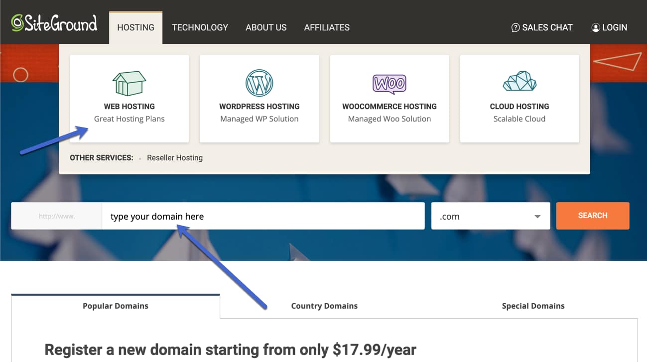 - SiteGround, InMotion, Bluehost, or any web hosting company: You may end up spending a little more for the service, but web hosts have all-in-one packages where you grab a domain name, install WordPress, and launch your site on a hosting server in one or two clicks. There’s no need for much technical knowledge when buying domains from hosts. Keep in mind that hosts have regular promotions that say you get a free domain for a year, but you can bet it’s wrapped into the monthly or yearly price.