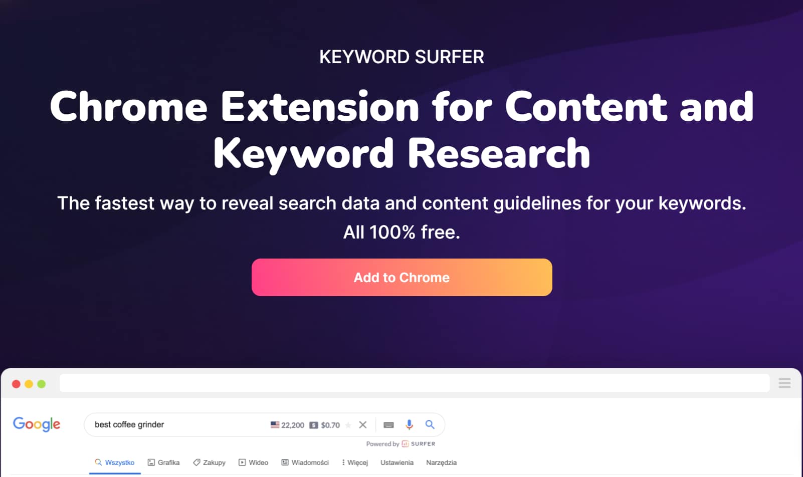 Keyword Surfer is a Chrome extension that gives you a handful of stats and keyword suggestions every time you search for something in Google.