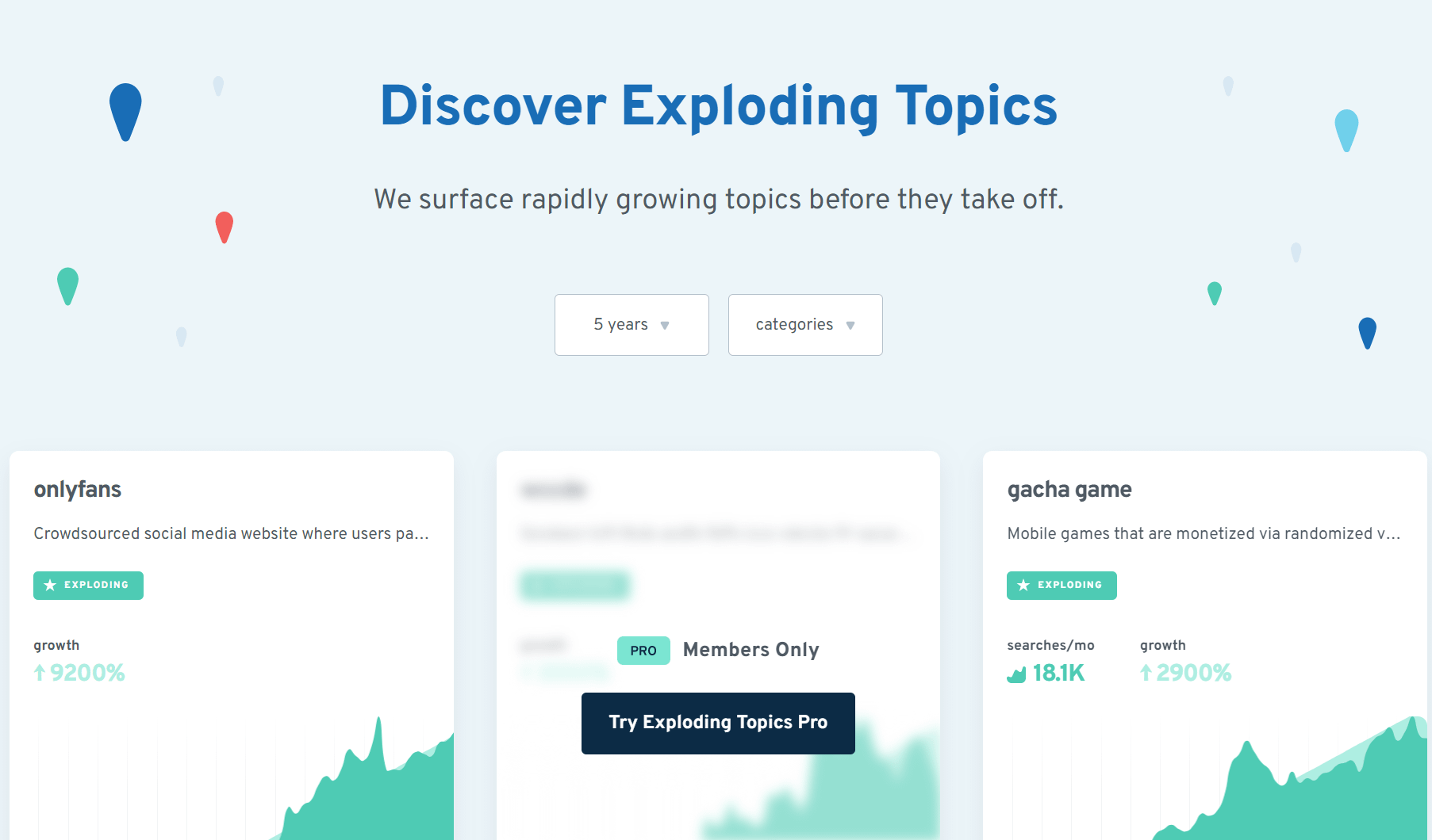 Exploding Topics is a free tool that promises to help you discover growing topics before they turn hot. Select a period and a category, and let the tool do its magic. If you do not select a category, the tool will suggest the most ascending topics overall.