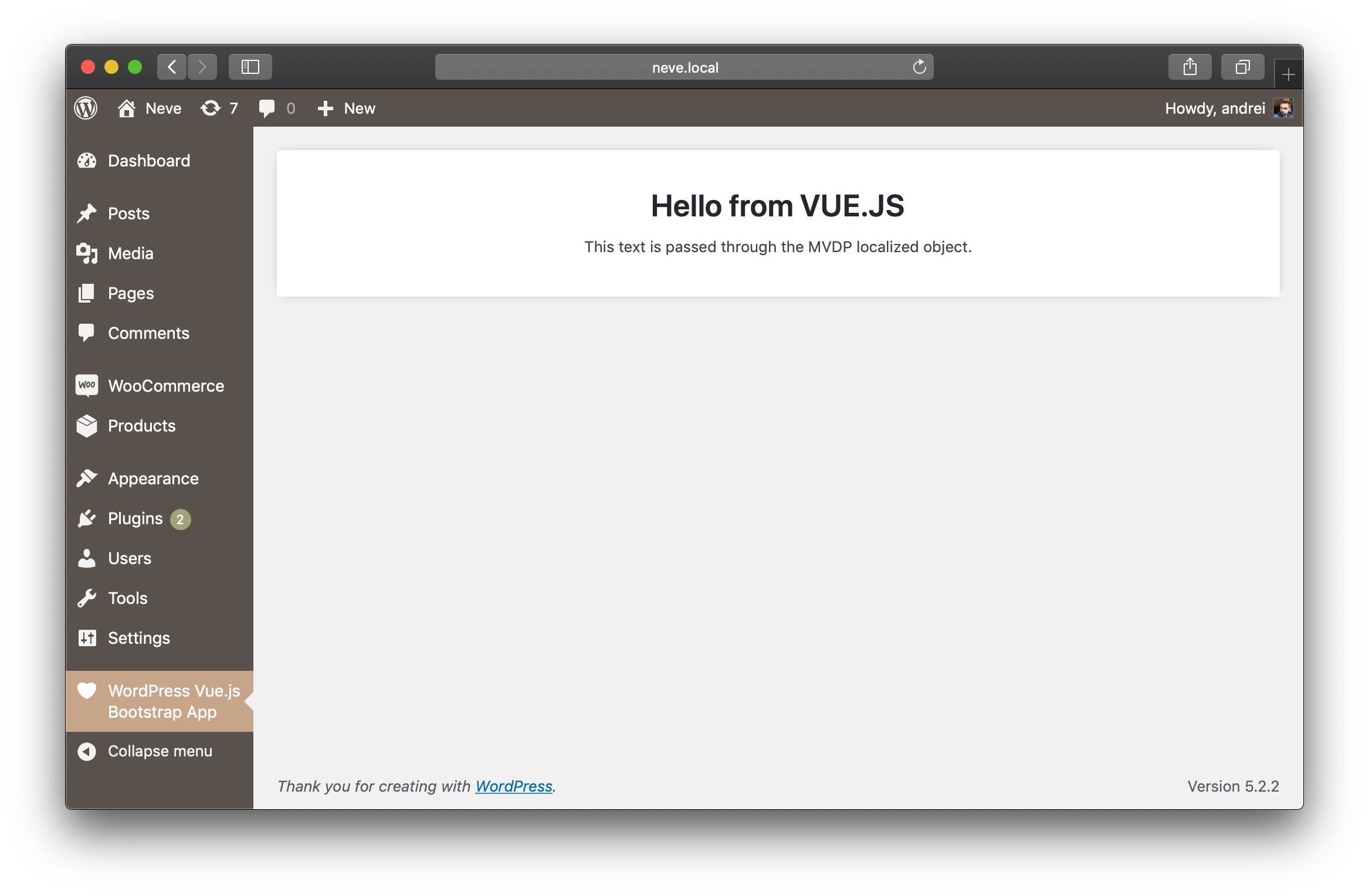 Not much. This is just a basic application that displays some data from the backend. Not much Vue under the hood. You can go ahead to the Plugins Dashboard page and activate it. It’s going to add a new page in your Admin Menu. Upon navigating to it, you’re going to find a dashboard page with two strings: