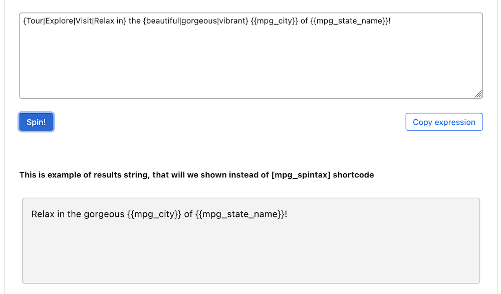 If Spintax is new to you, consider it a way to generate similar content based on the seed paragraphs provided by you. This can be a good method if you want to create unique-sounding content for the pages you generate.
