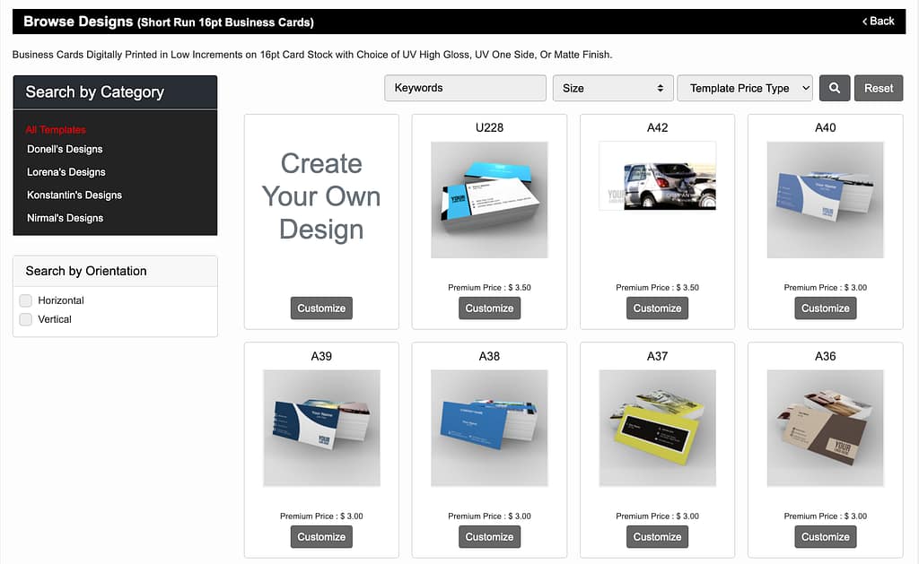 Now, they have around 280 templates, but there’s no filter to help you find something for your industry. You’ll save time using their business card maker.