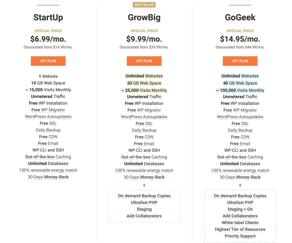 - If you’re running WooCommerce, a lot of different WordPress sites, or need staging, choose the GoGeek plan.