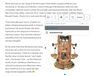 To link the media file, you’ll want to click on the image so that the floating “button pane” appears above the image. (You can see an example at right.) Inside of that floating pane, you’ll want to click the “link” button, which looks a bit like a few “chain links” (it’s gotten more impressionistic in more recent iterations of the block editor). It’s the blue one in the image at right. Next, they’ve made what we want—link directly to the “media file”—easy, so just select “Media File”, as the first value from the “dropdown.”