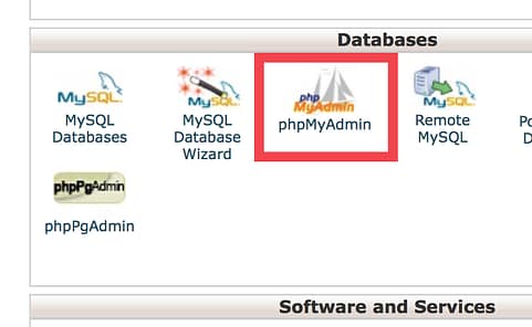 - Once you’re in your cPanel, scroll down to Databases and select phpMyAdmin.
