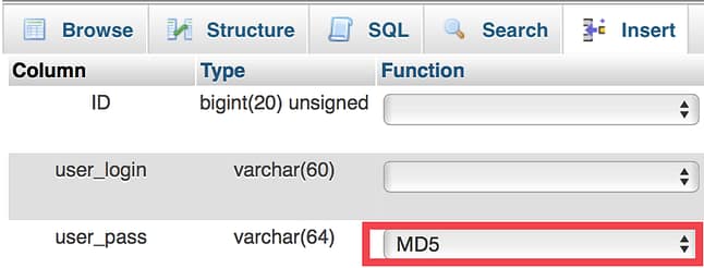 - Click on the dropdown menu on the same line and select MD5. This’ll run the MD5 hashing algorithm on the value we just typed, making it into one that WordPress can work with. Hashing functions are a core part of how passwords are stored securely. David wrote a longer post about that, if you’re interested.