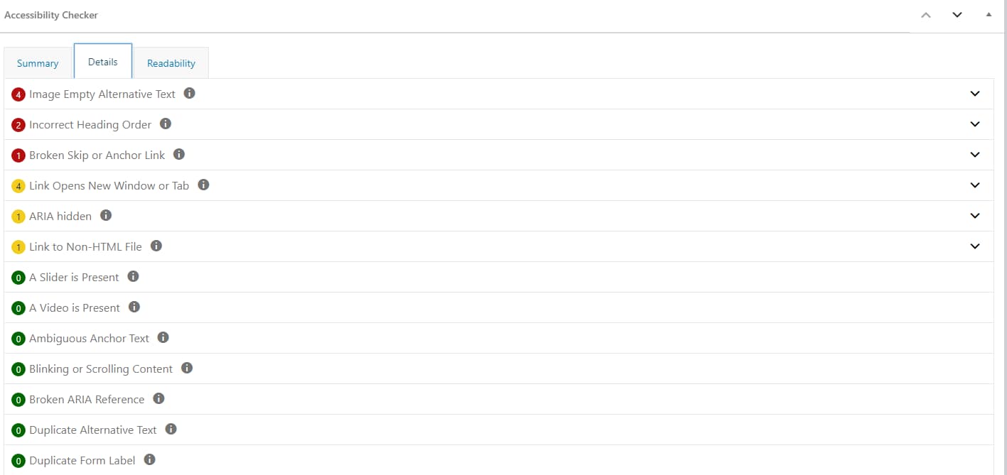 Accessibility Checker can be used by WordPress users of all skill levels, whether you need it for one site or multiple. The free Accessibility Checker plugin can be downloaded on WordPress.org, and the Accessibility Checker Pro plugin can be purchased from Equalize Digital. With Accessibility Checker there are no limits to the number of pages scanned (or associated API fees), and reports are visible right on the post edit screen.