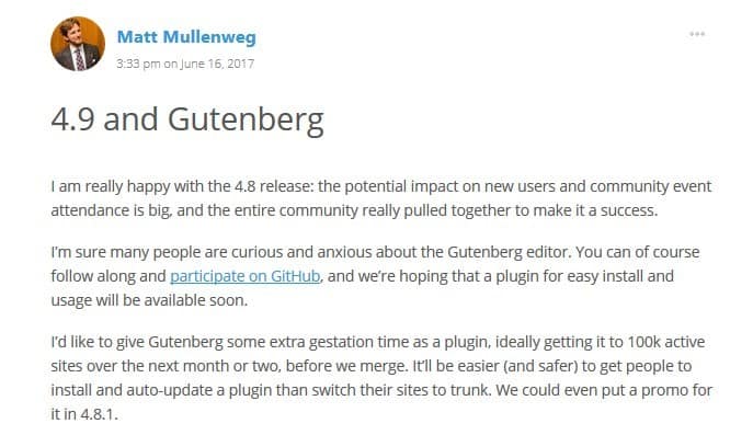 There’s one more piece of news related to Gutenberg and what’s to come to WordPress in the near future. In his entry at WordPress.org, Matt Mullenweg shared a few hints regarding what to expect from the upcoming major versions of WordPress, 4.9 and 5.0.
