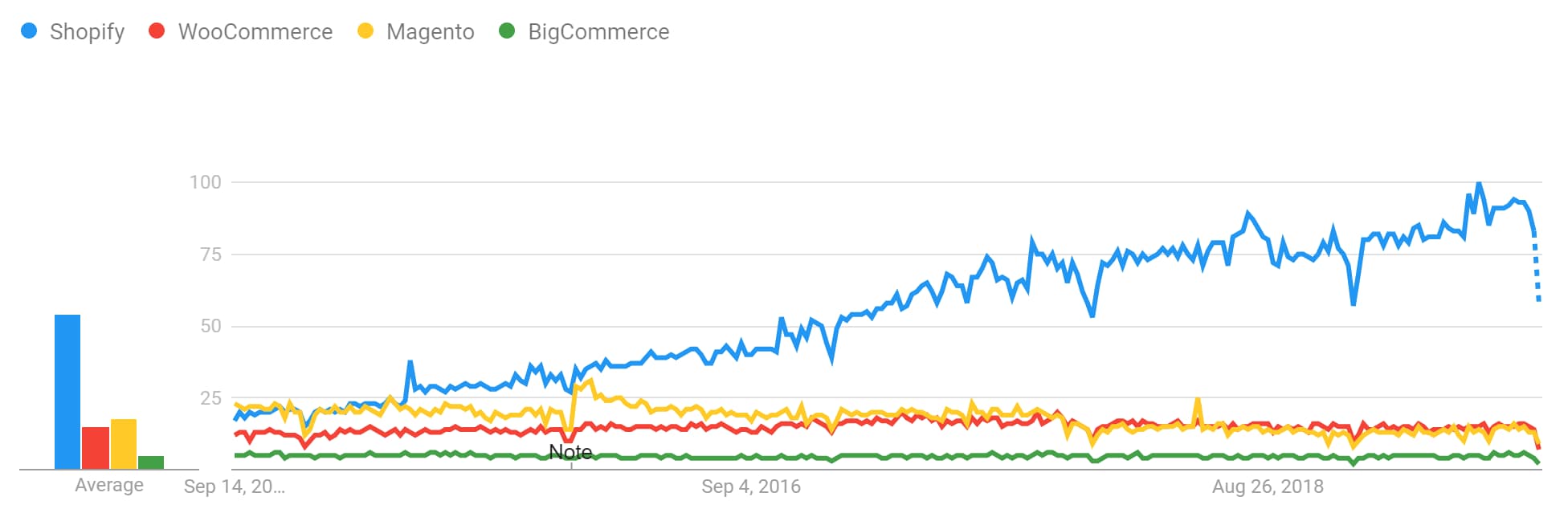 Everyone has their own way of looking at Google Trends, but the thing to keep in mind is that Google’s “interest over time” metric only relates to search term popularity – as in, how often people search for something – it does not reflect, however, what happens afterward, or which one is the best ecommerce platform.