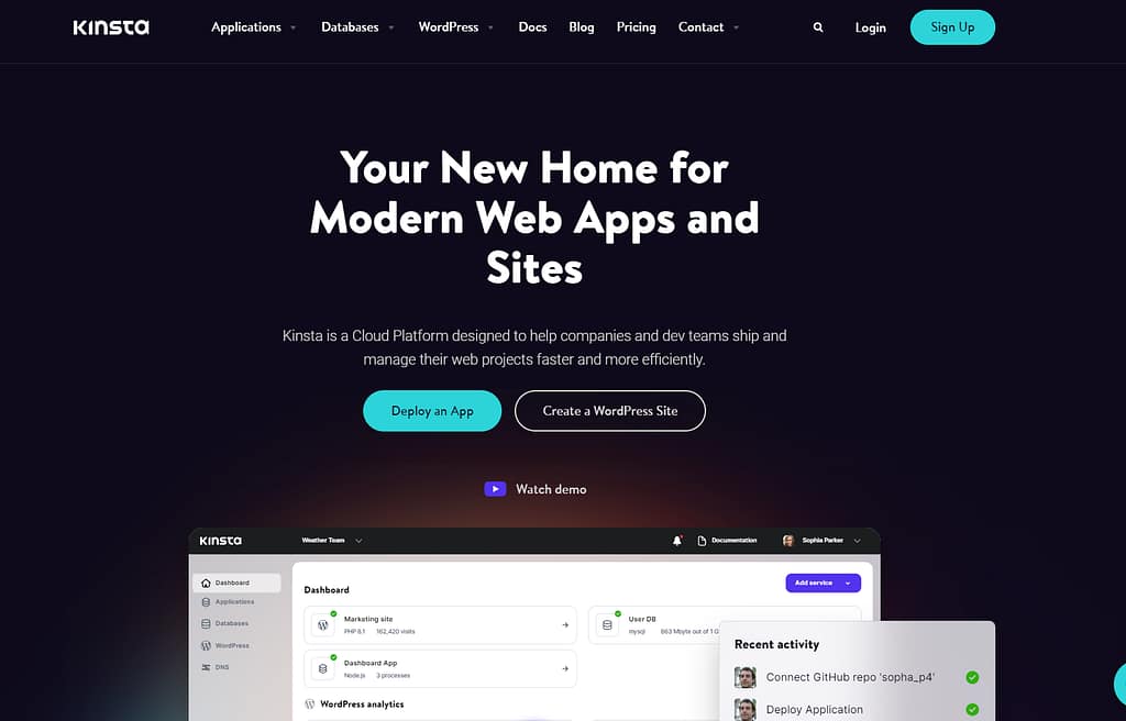 Kinsta does come with two hosting options for developers: application hosting (which lets you quickly upload your app to the cloud) and database hosting (which you can use to set up databases in a few clicks). Kinsta offers internal connections between your apps and databases with no imposed limits for query and row count.