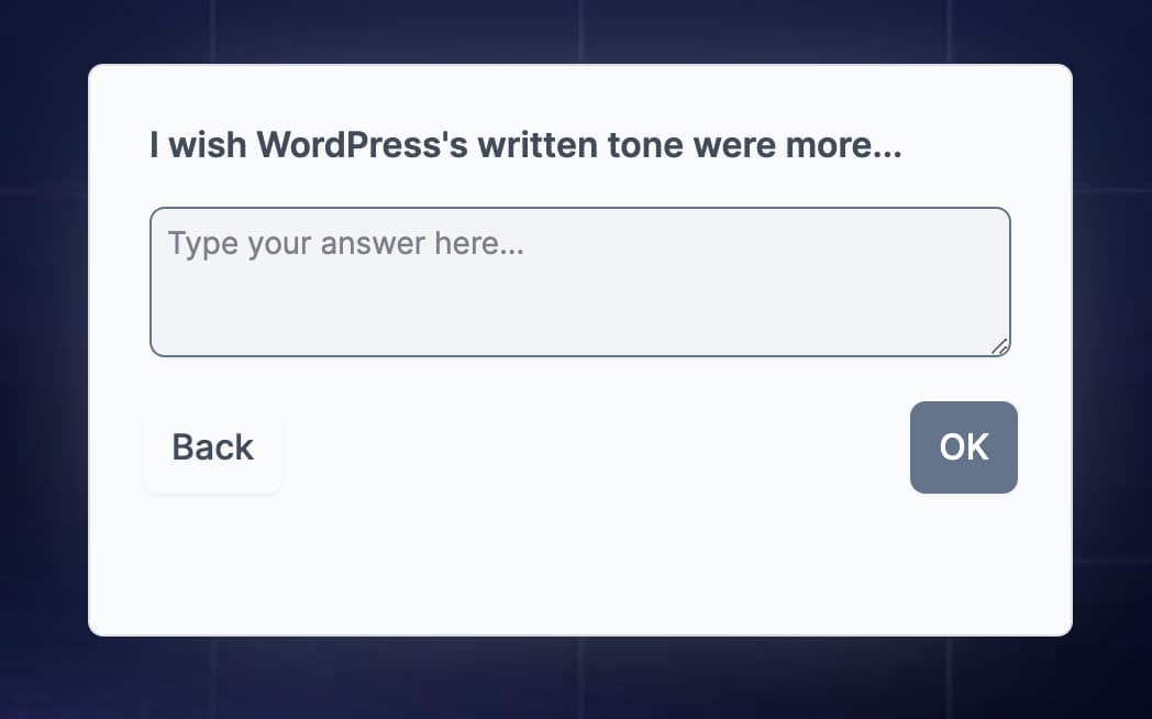 In order to see the brand voice in action, we selected six content pieces from the WordPress admin panel that were prompted with both original and alternative copy. In addition to the original/default version, the survey presented variations that were friendlier, more inclusive, or more empowering than the original. A technical/formal option was also available.