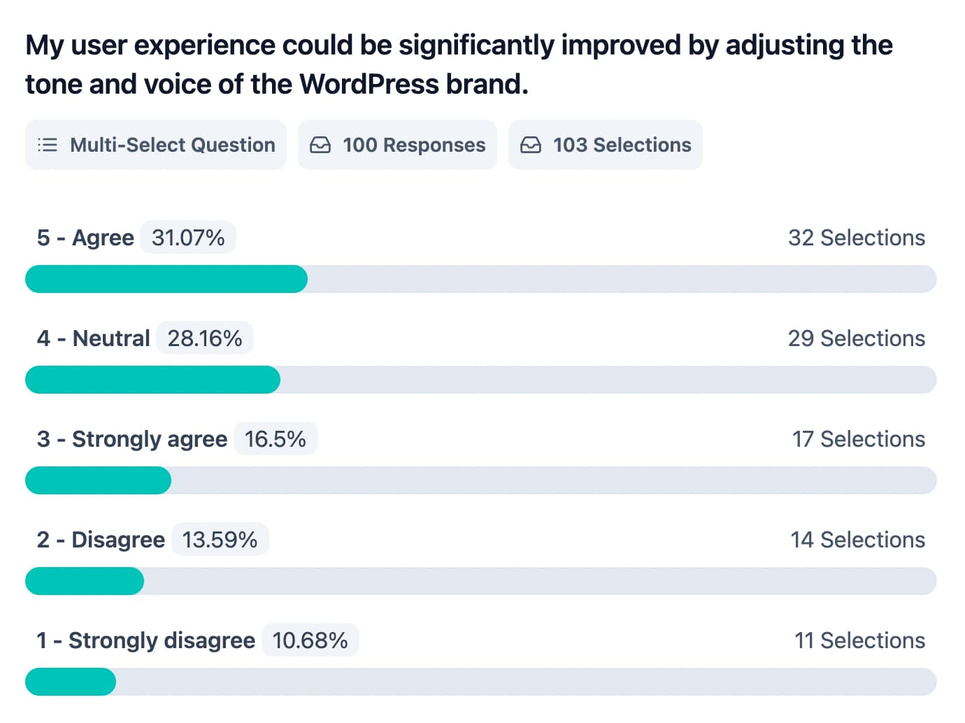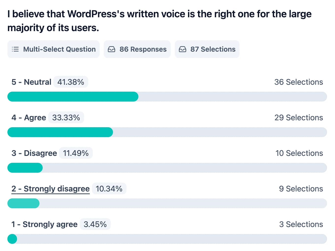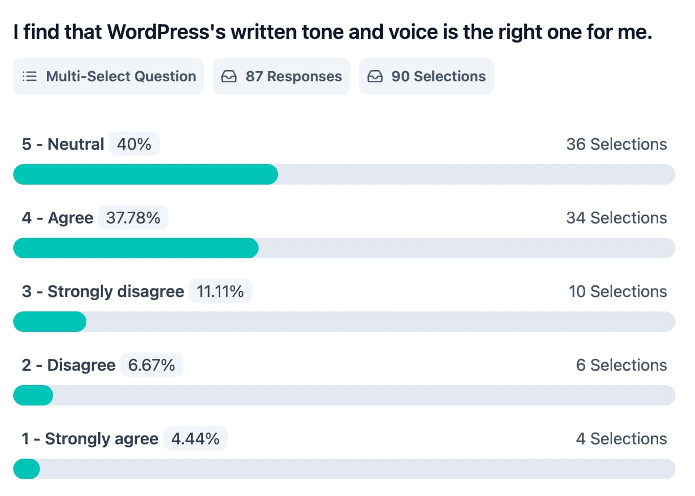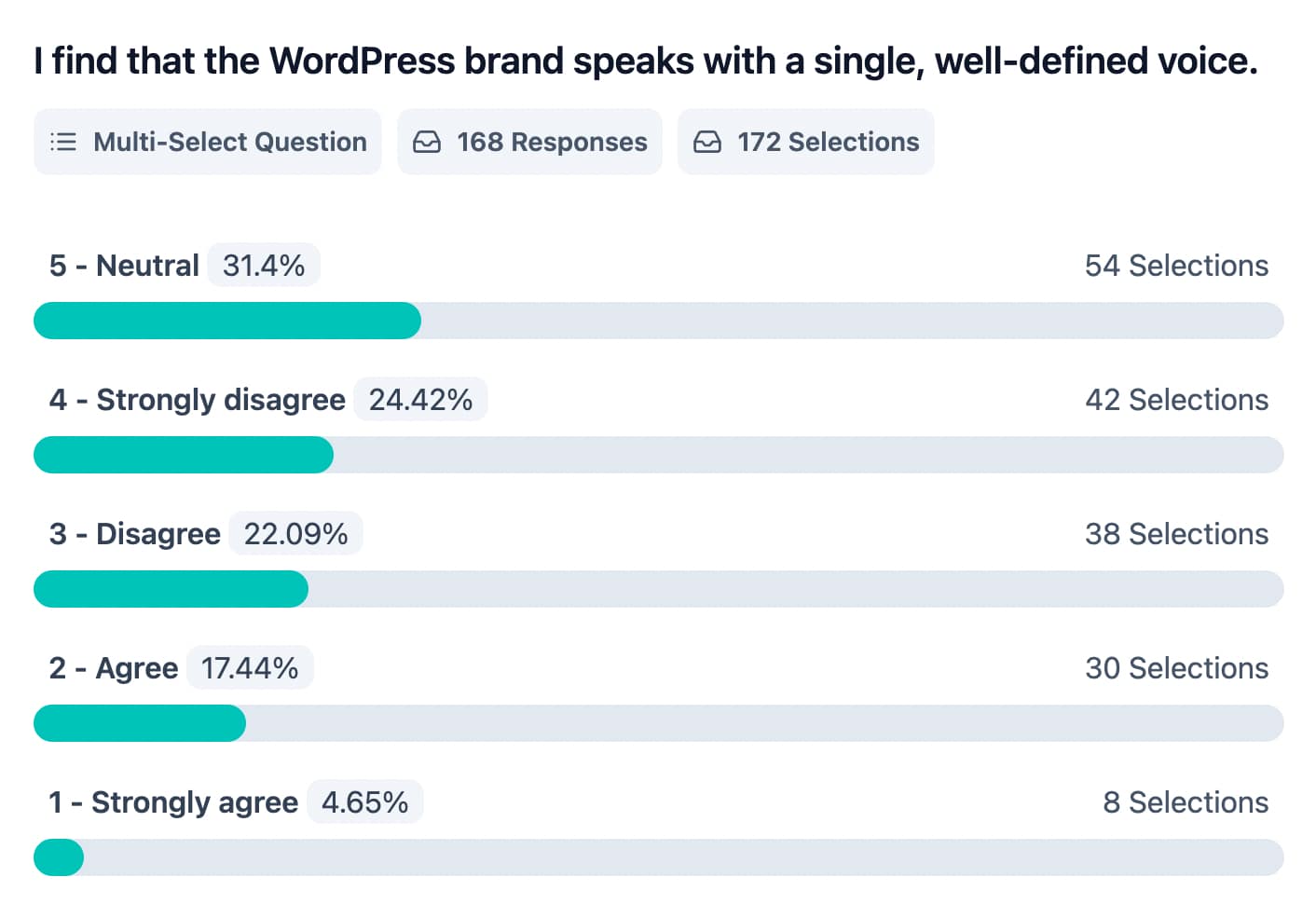 The responses to the two questions about whether the WordPress brand resonates with its audience (I find that WordPress’ written tone and voice is the right one for me / the large majority of its users) indicate that it is acceptable for many participants, but it does not inspire strong enthusiasm or support.
