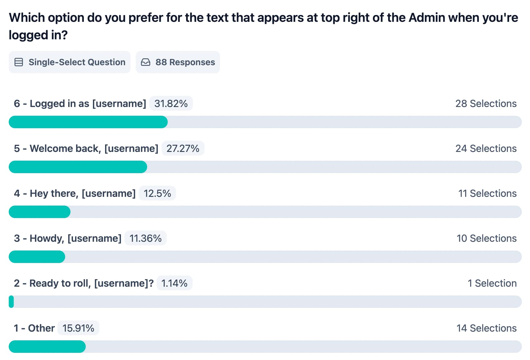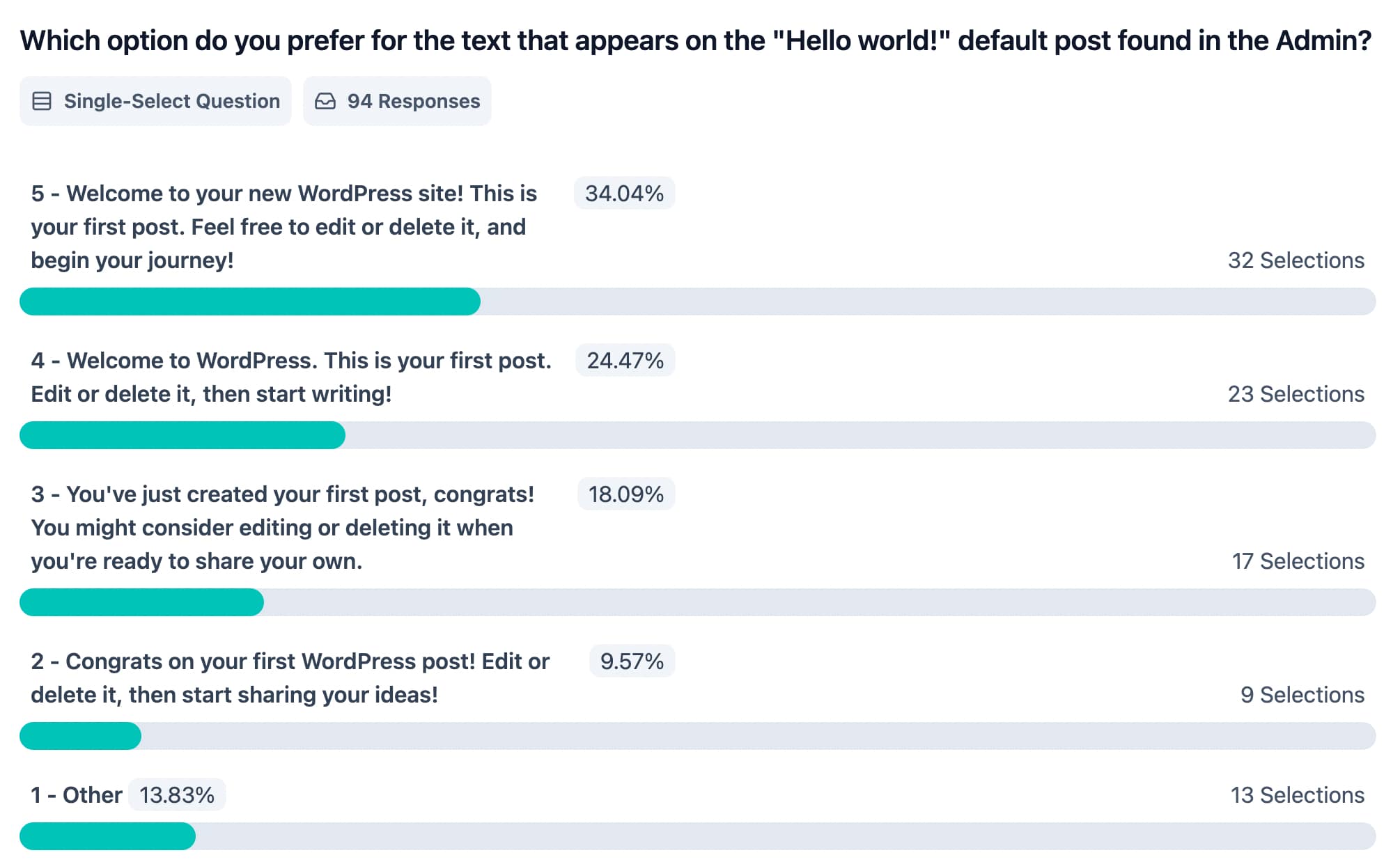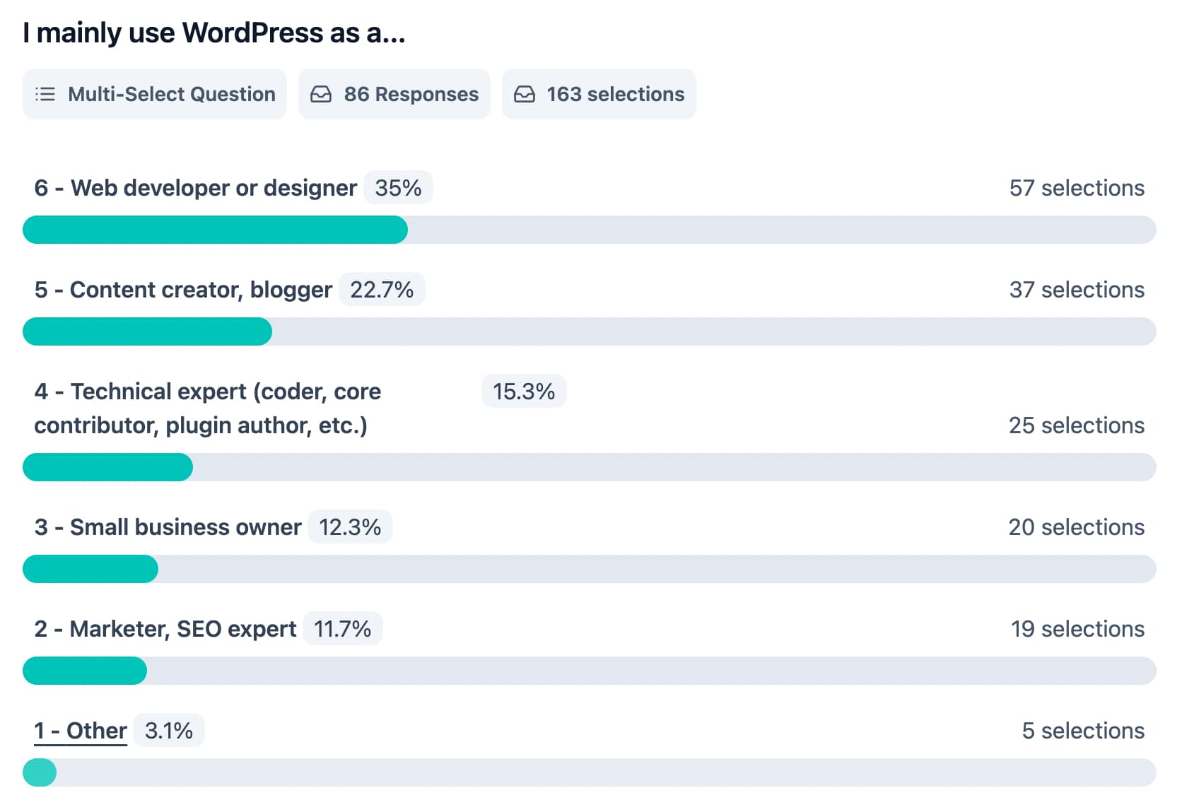 On average, it took respondents 2 minutes and 20 seconds to complete the survey, with 36% answering all 16 questions. This is a strong engagement rate, especially for a survey of this length (10+ questions), which typically sees a completion rate of 20-30%. This suggests that participants were genuinely interested in the topic and felt a connection to the WordPress brand.