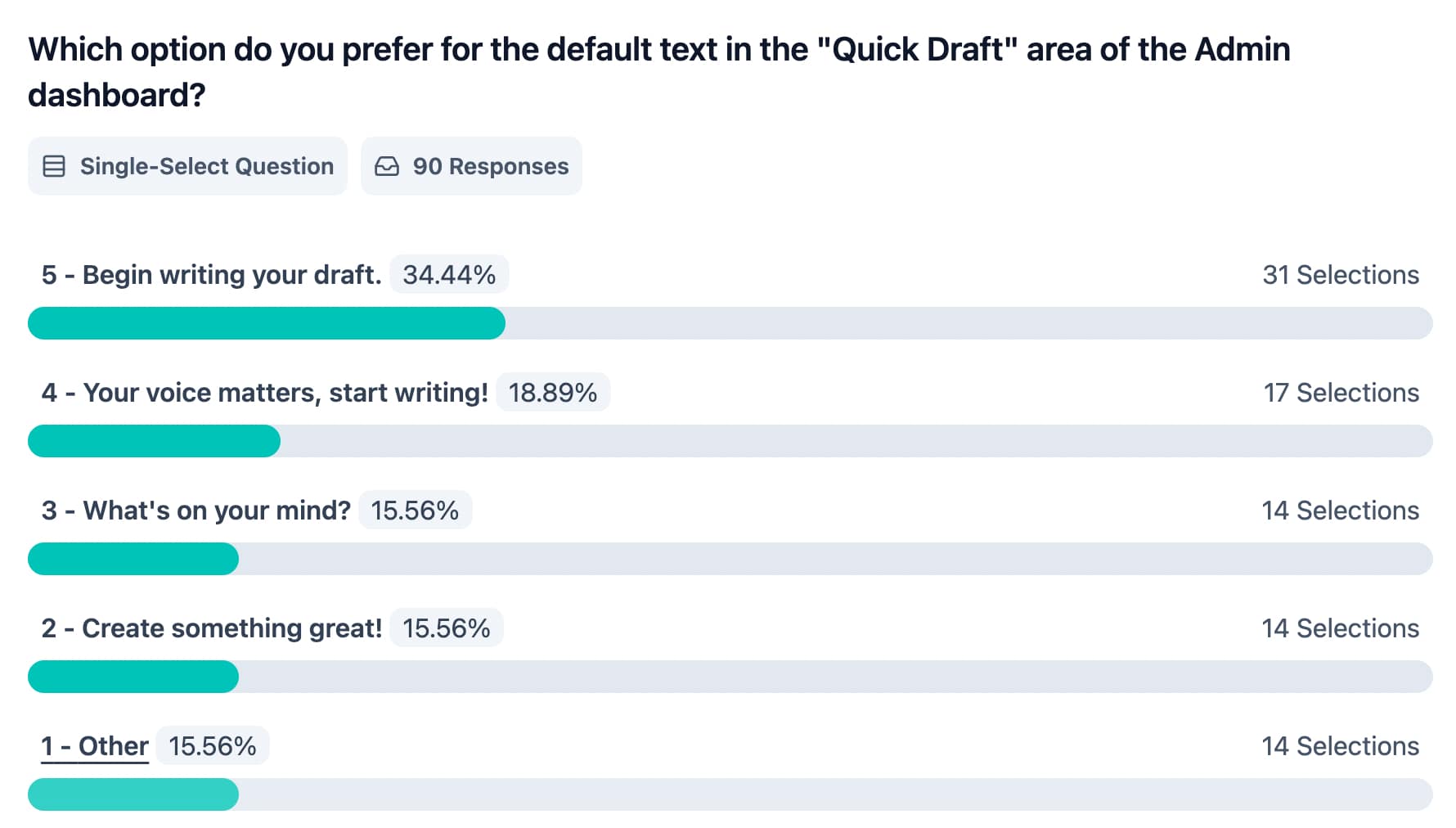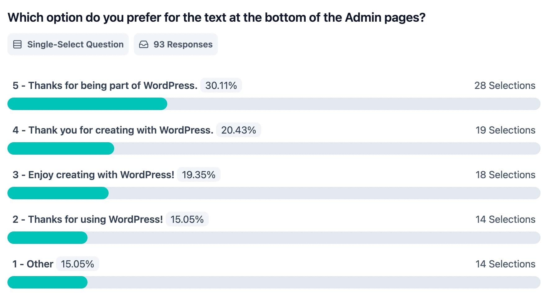Even though the questions about tone and voice included predefined, easy-to-click answers, most respondents chose to type in their own thoughts. Many of those responses criticized Matt Mullenweg in relation to the latest rumblings in the community. Some of those opinions were included in a separate section of this report (see below).