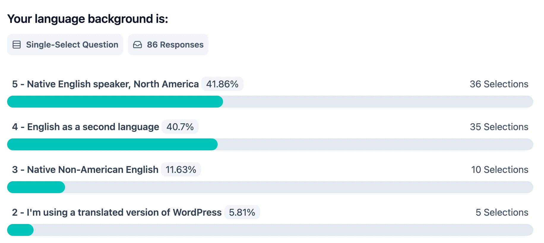 💡 Main takeaway: Respondents are proficient WordPress developers, mostly native English speakers.The vast majority of respondents are proficient WordPress users (75.5%). 20.9% are intermediate and only a small percentage come off as beginners (3.5%).