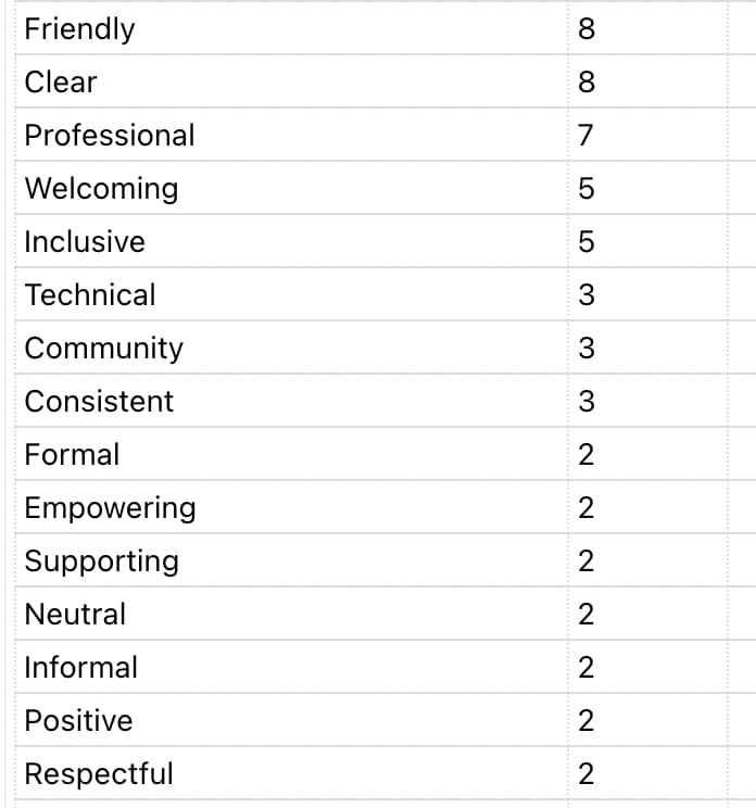 💡 Main takeaway: WordPress needs to be more professional.We’ve received a wide range of responses (82) to the open-ended question about what the WordPress’ tone should be like. A word analysis revealed that the most frequently mentioned terms that are not currently included in the brand voice guidelines are “professional” (7 mentions), “welcoming” (5 mentions) and “technical” (3 mentions). They have replaced the default “respectful” (2 mentions), “empowering” (2 mentions) and “composed” (0 mentions).