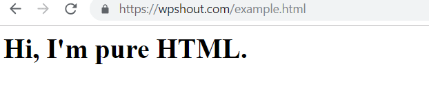 If we then upload example.html to the web server that the wpshout.com domain points to, we can do something cool: we can open our web browser, visit wpshout.com/example.html, and see the text “Hi, I’m pure HTML.” in a nice big header on an otherwise blank page.